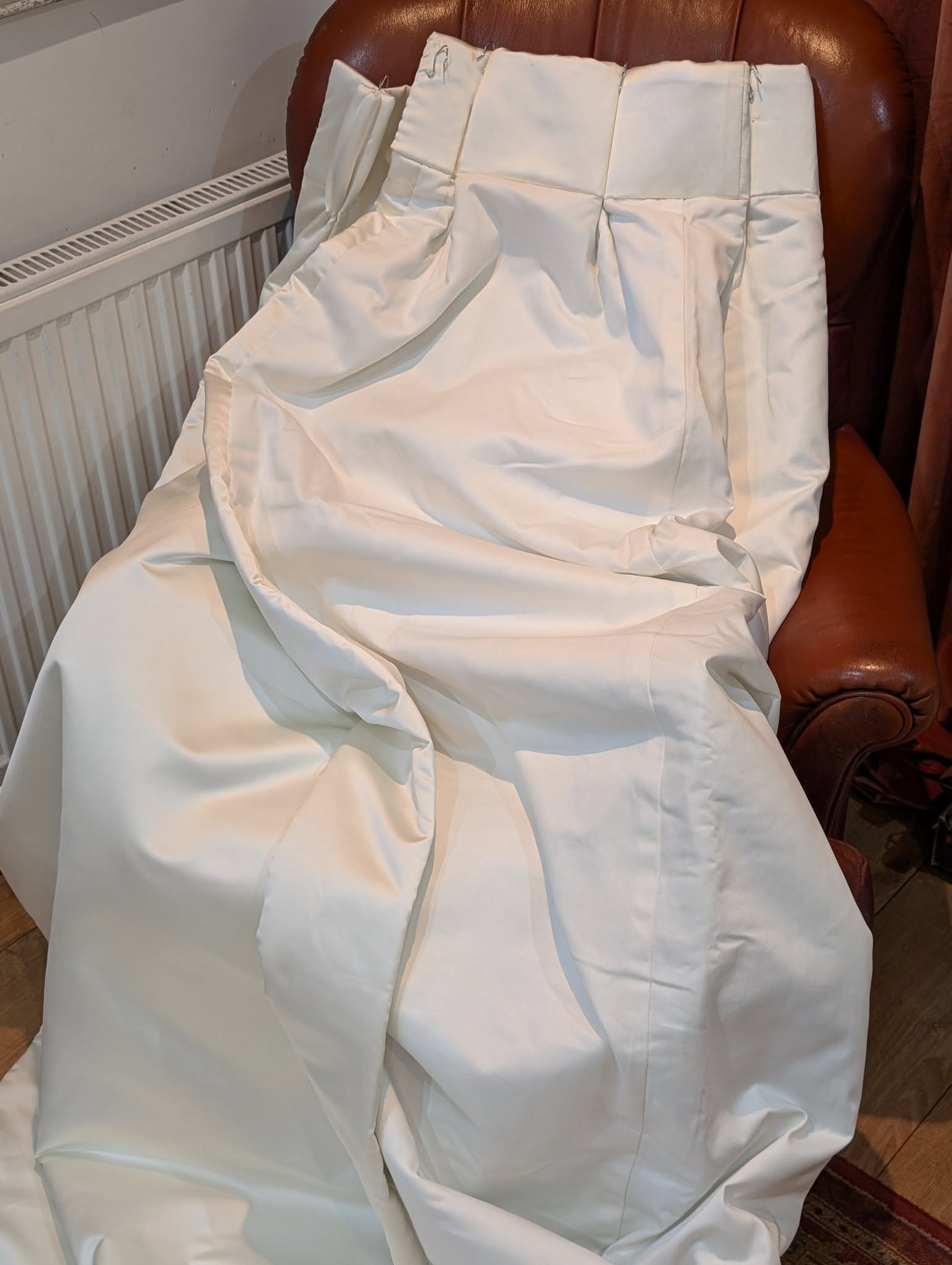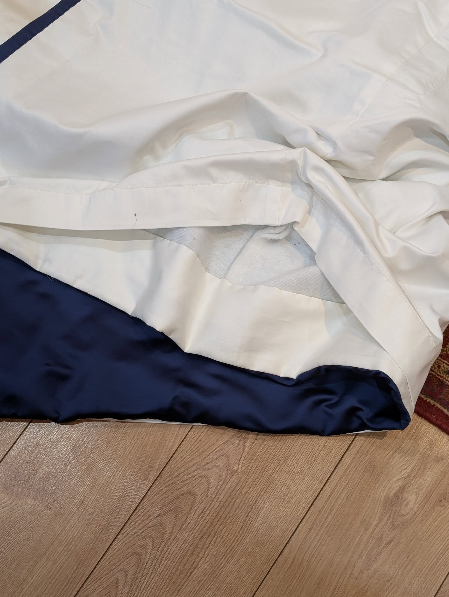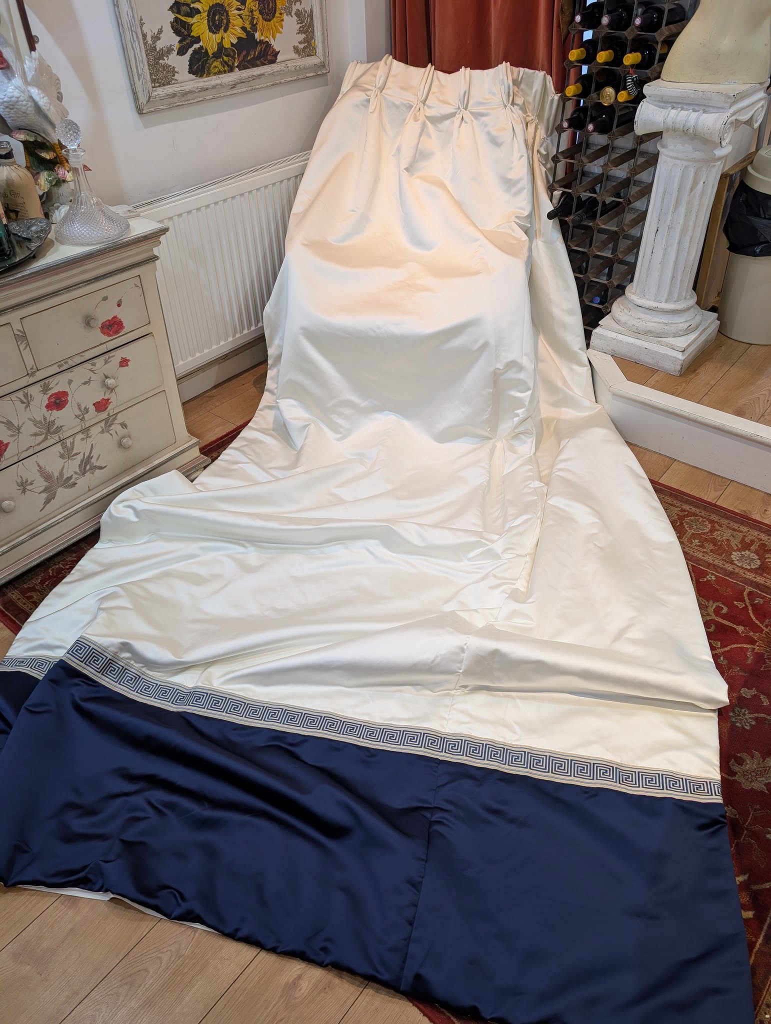 This listing is for a pair of extra long white sateen pinch pleat second-hand curtains with interlining. These excellent curtains, complete with royal blue sateen bottom hem, are in pristine condition and ready for a new life somewhere.