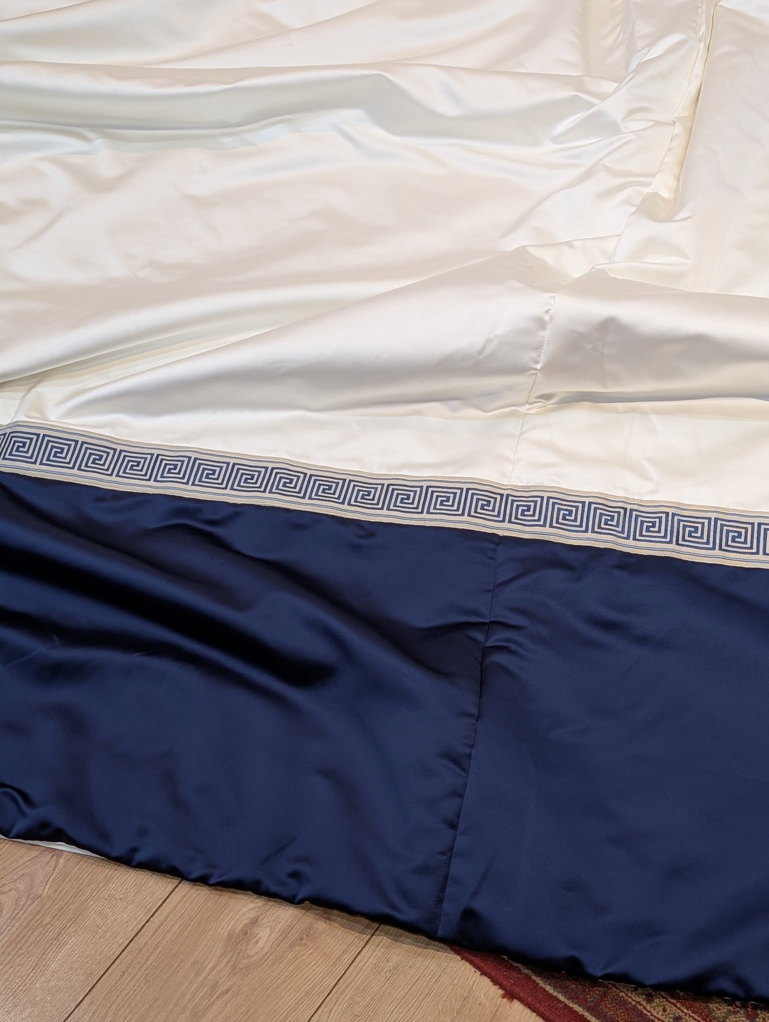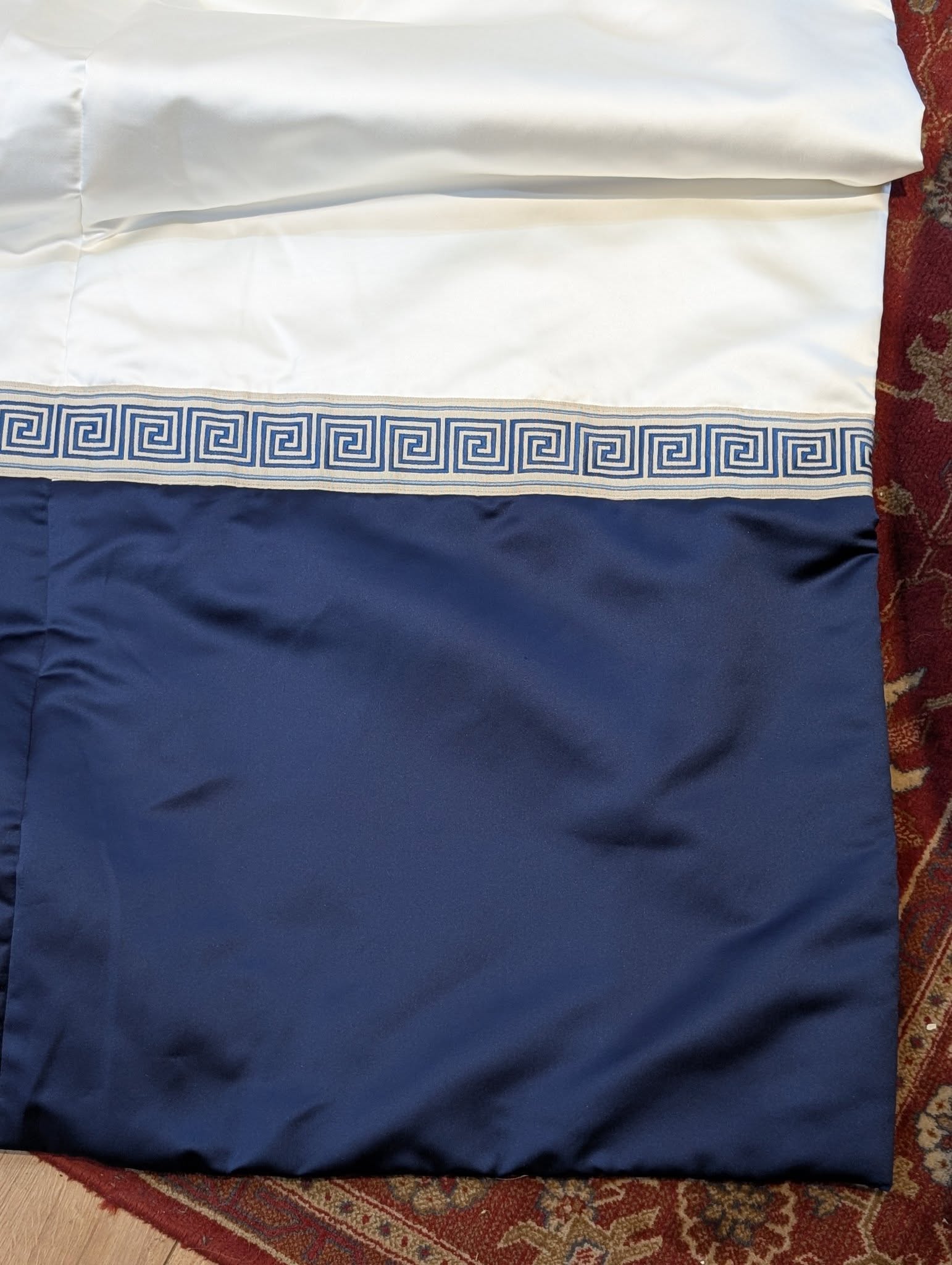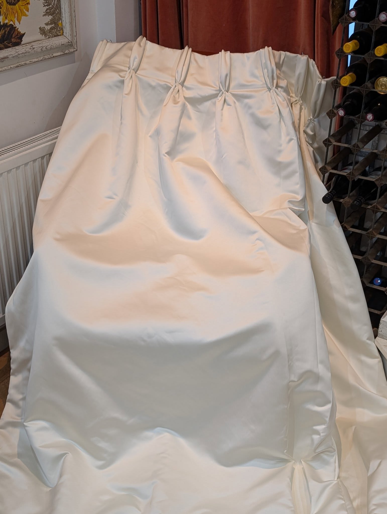 This listing is for a pair of extra long white sateen pinch pleat second-hand curtains with interlining. These excellent curtains, complete with royal blue sateen bottom hem, are in pristine condition and ready for a new life somewhere.