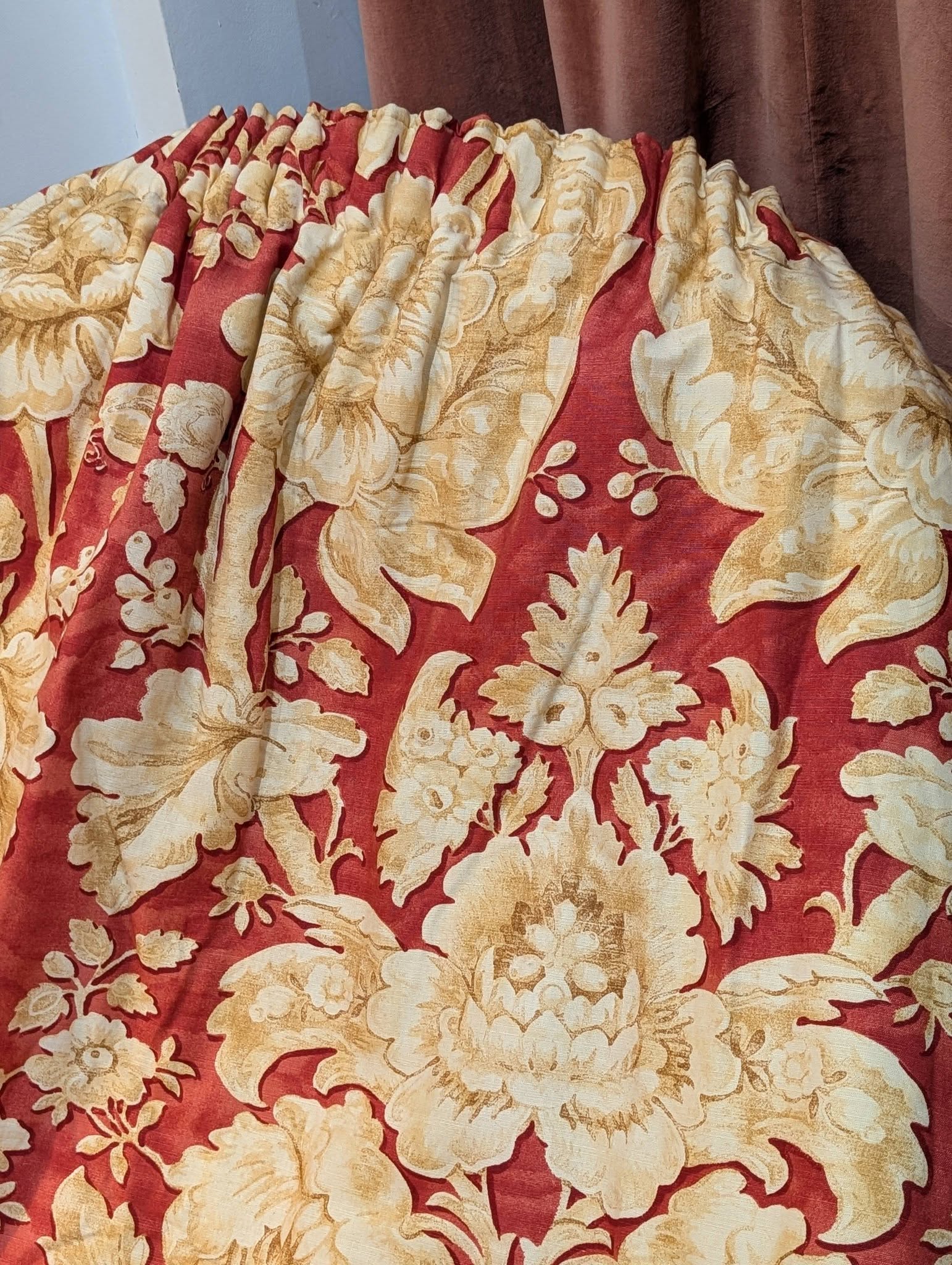 This listing is for a pair of vintage Osborne & Little terracotta and cream second-hand curtains. These curtains come with pencil pleats and interlining and are in good vintage condition.