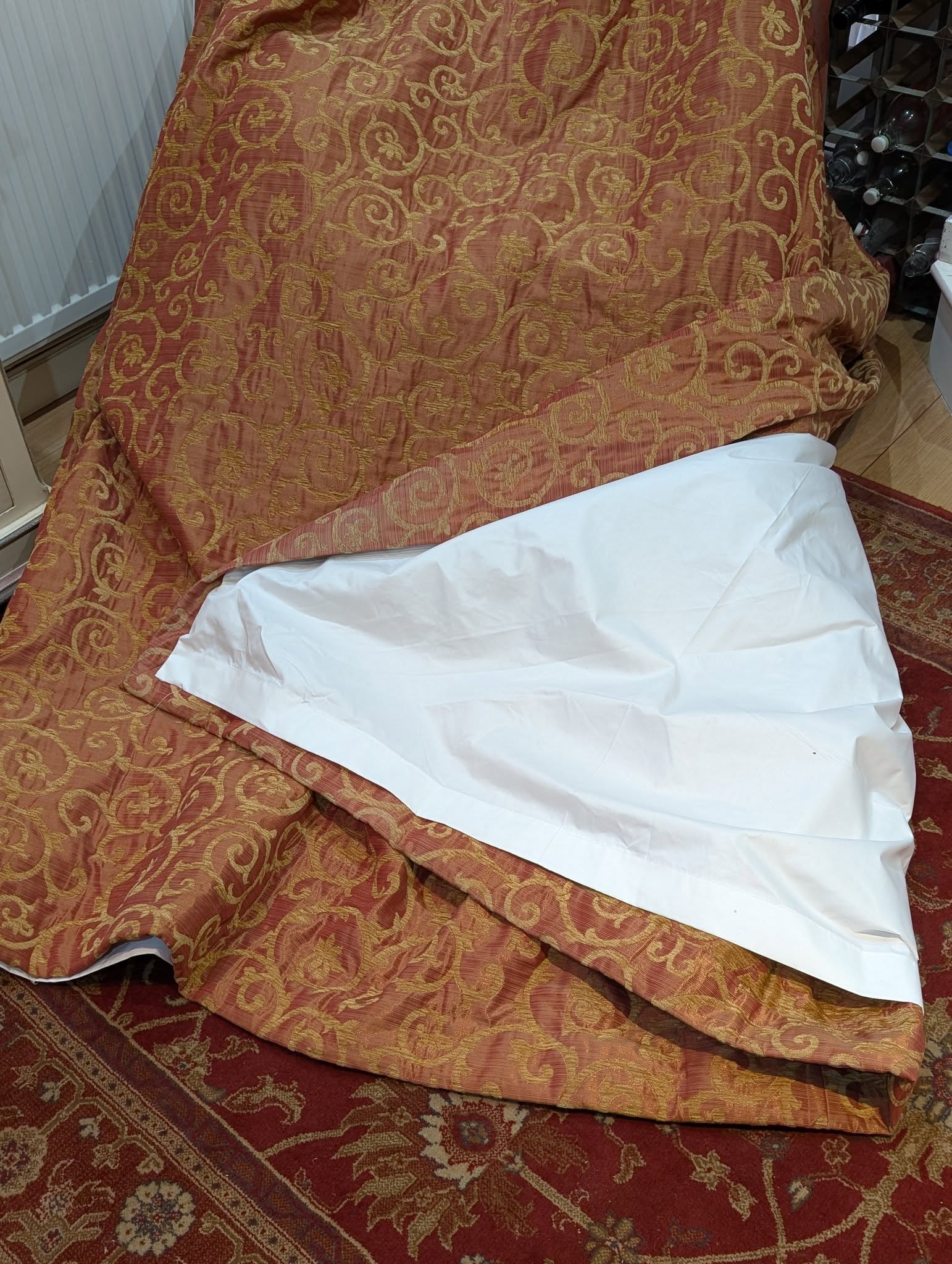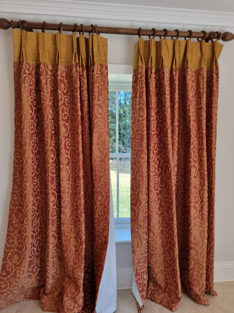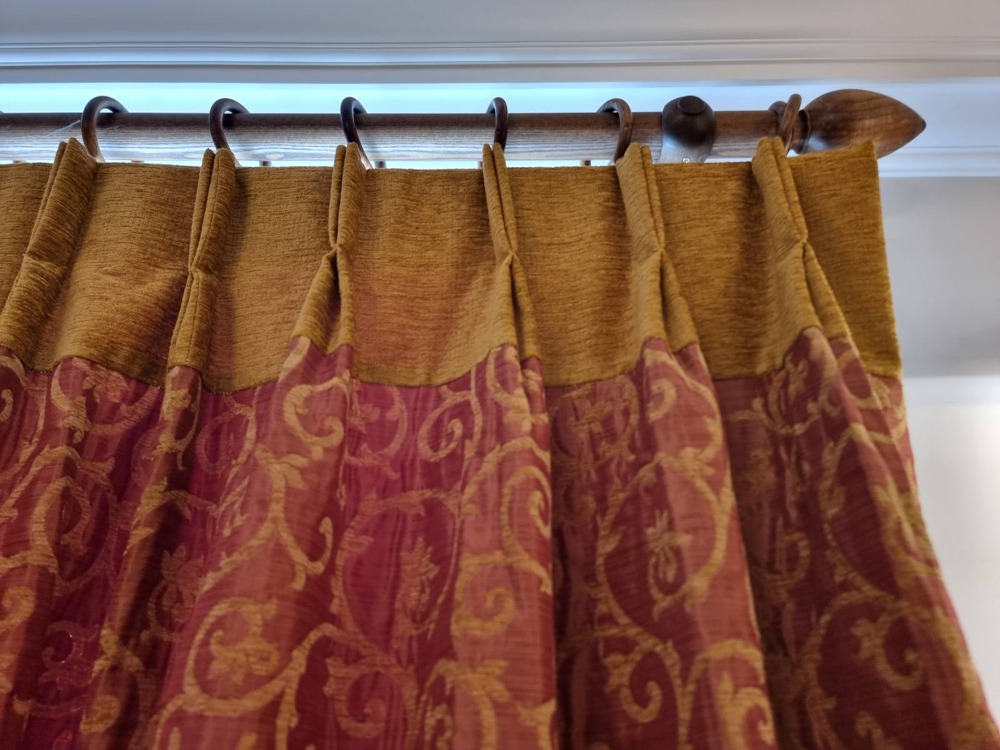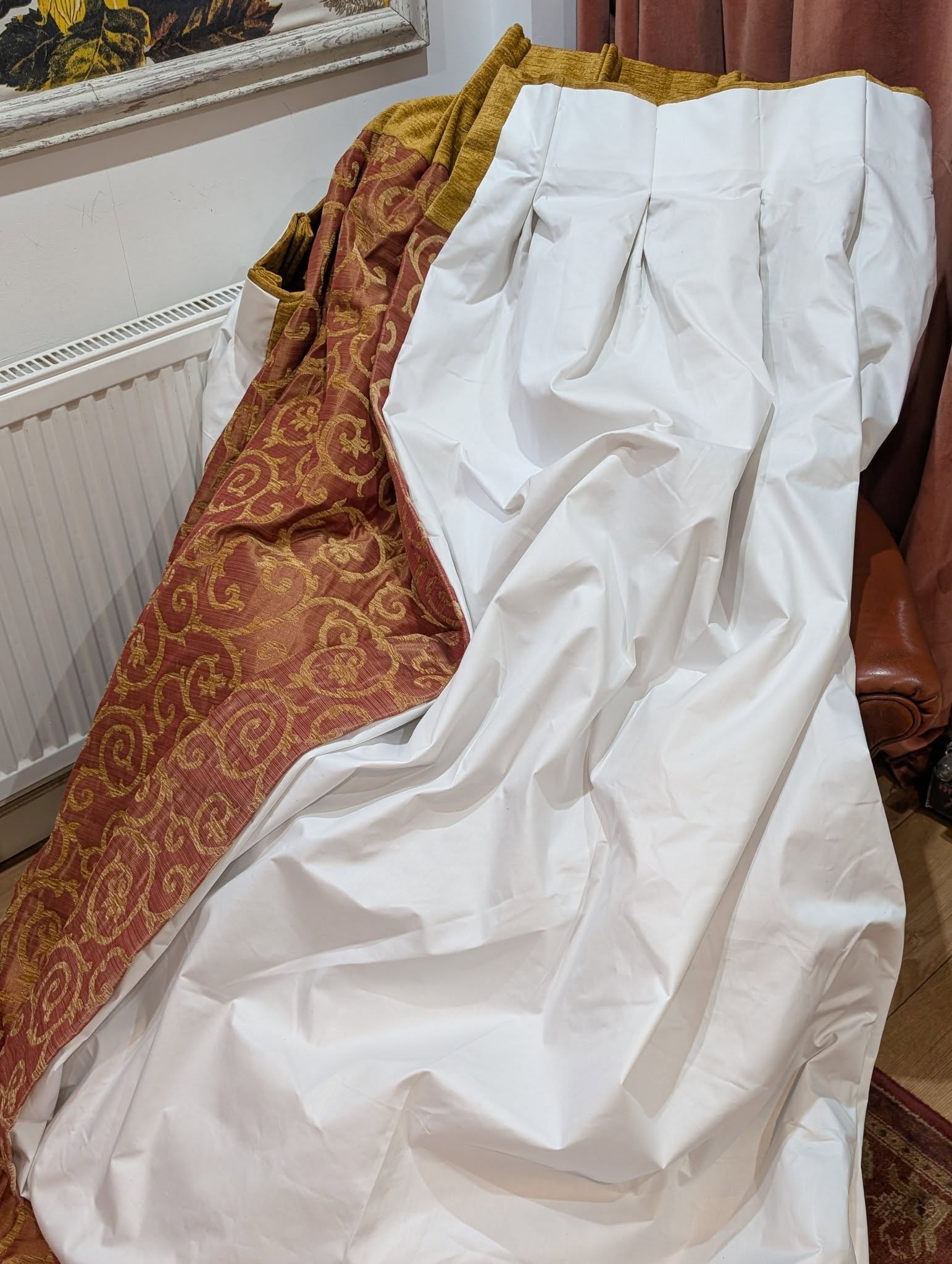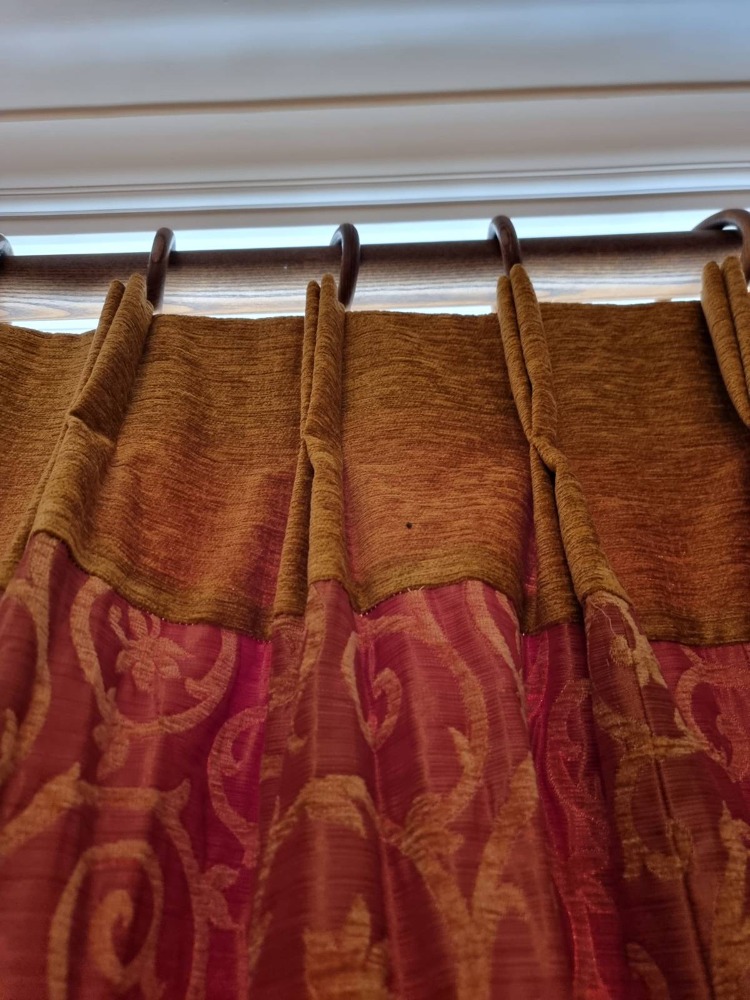 This listing is for up to two pairs of pristine terracotta/gold pinch pleat second-hand curtains with interlining. Both pairs of these stunning curtains are in immaculate condition and totally ready for a new life.