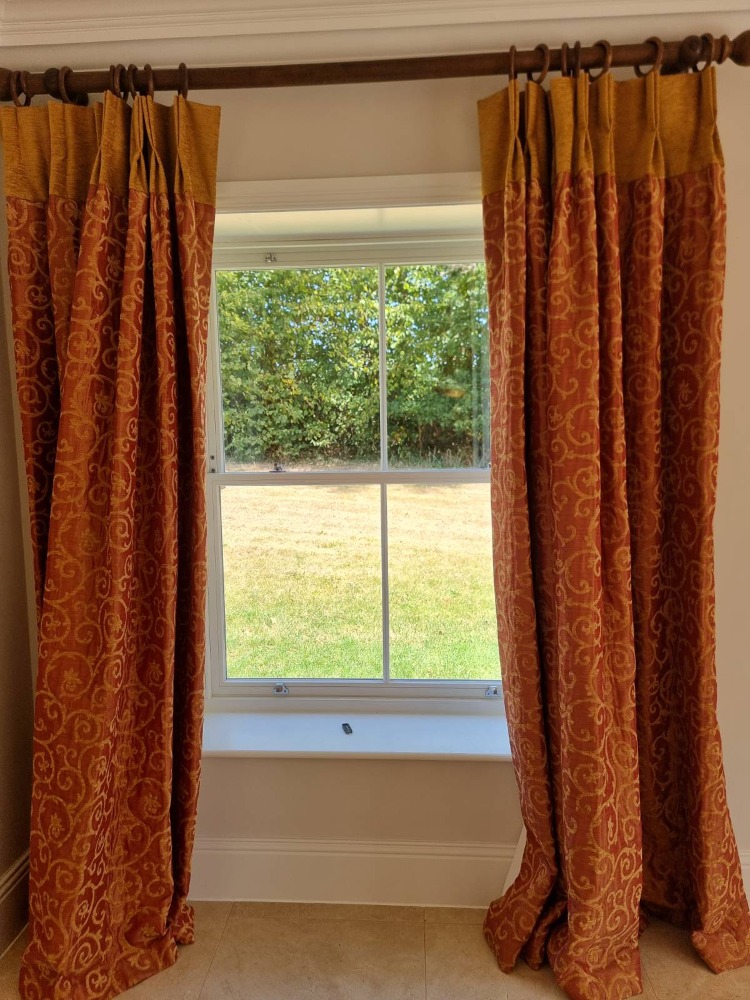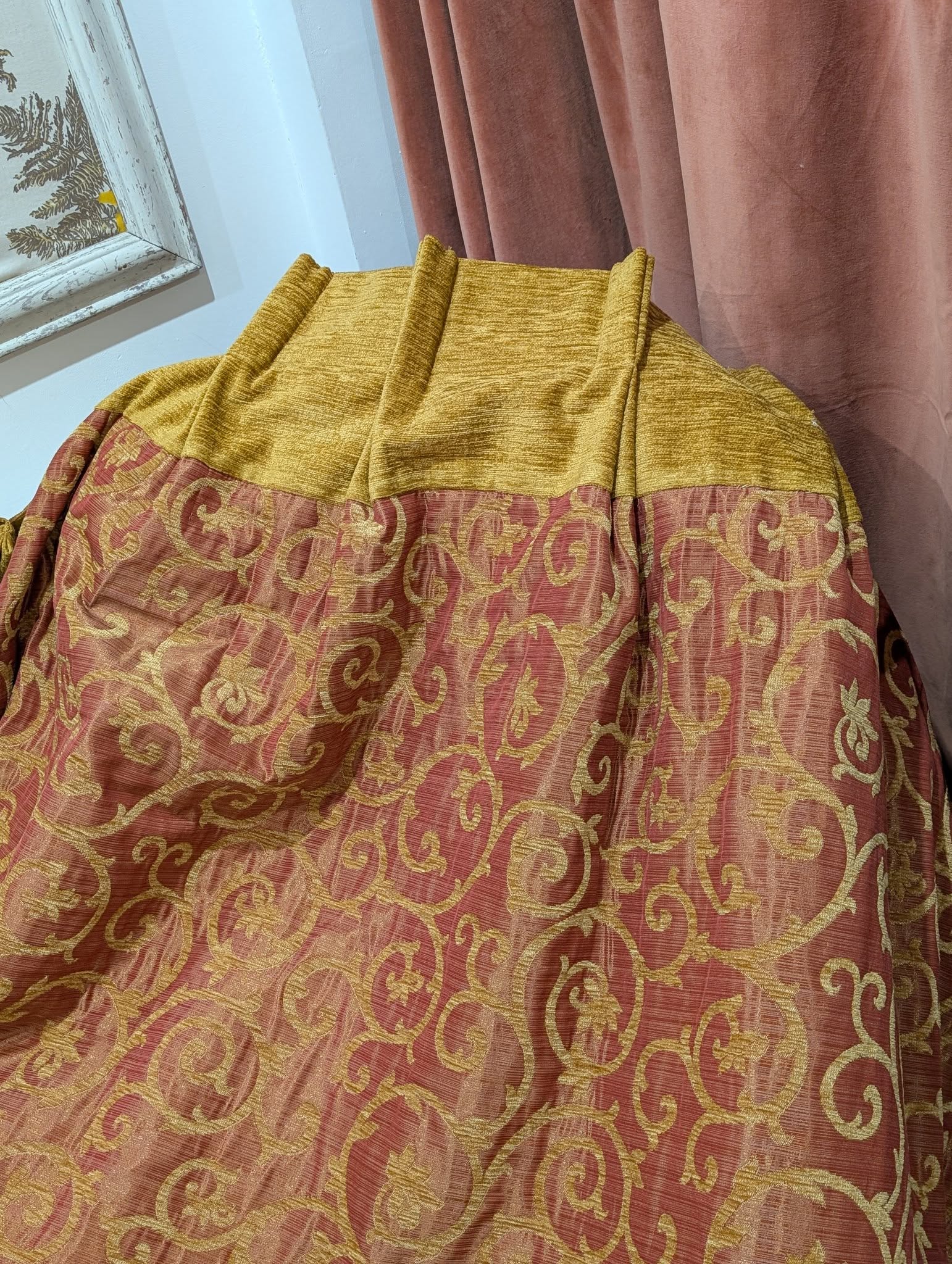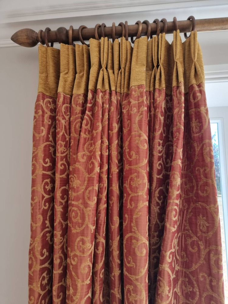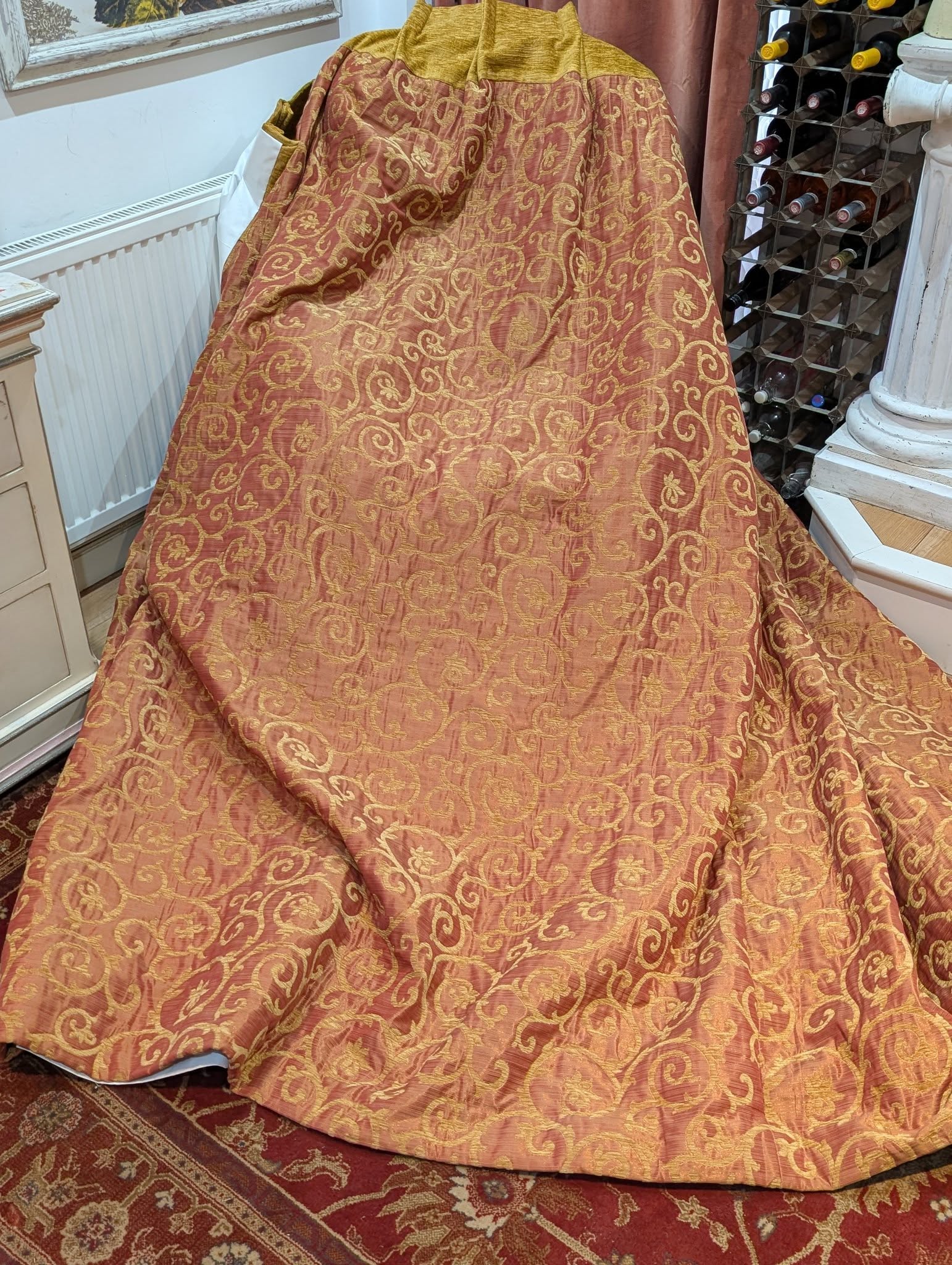 This listing is for two pairs of pristine terracotta & gold pinch pleat second-hand curtains with interlining. Both pairs of these stunning curtains are in immaculate condition and totally ready for a new life.
