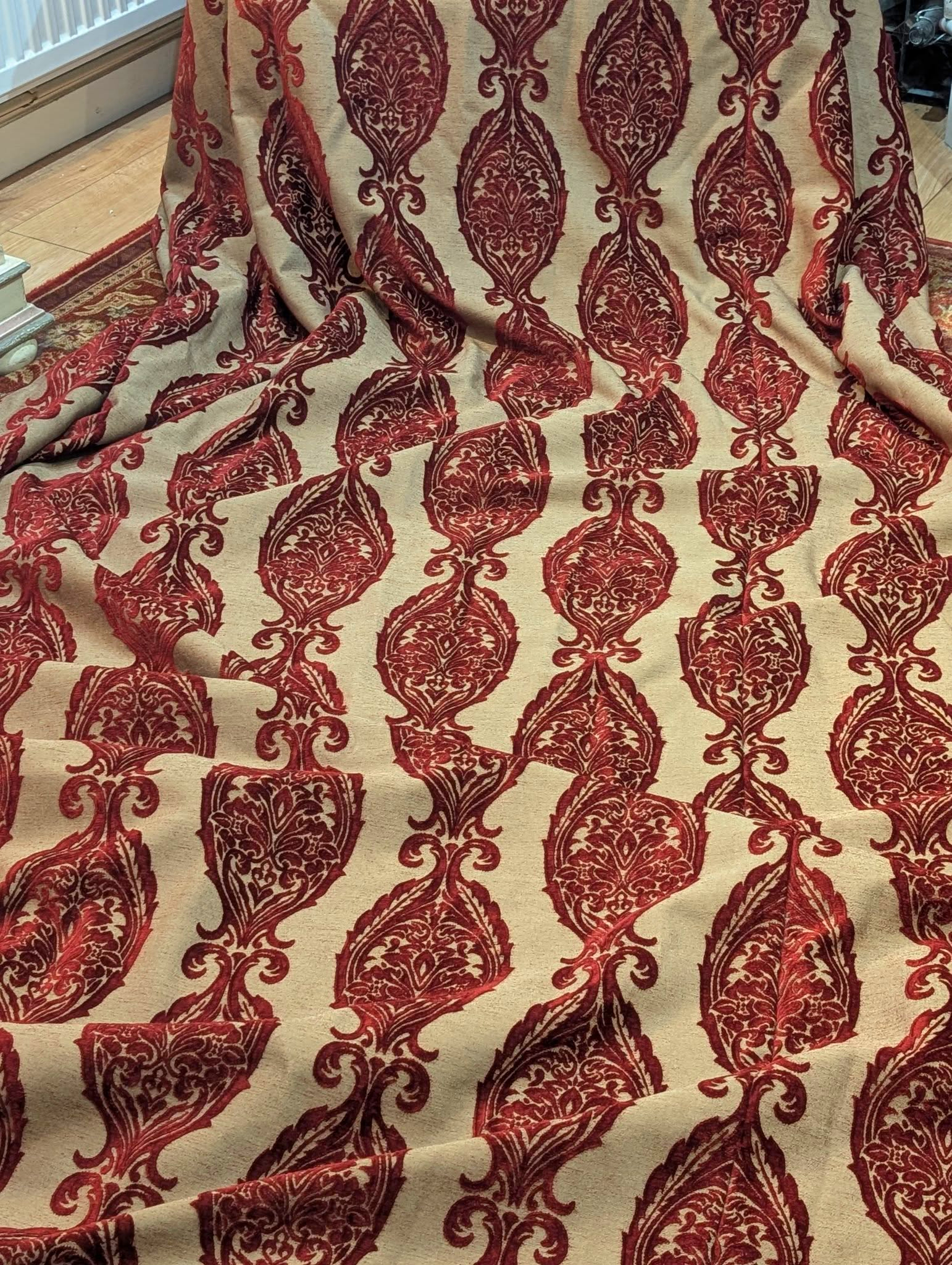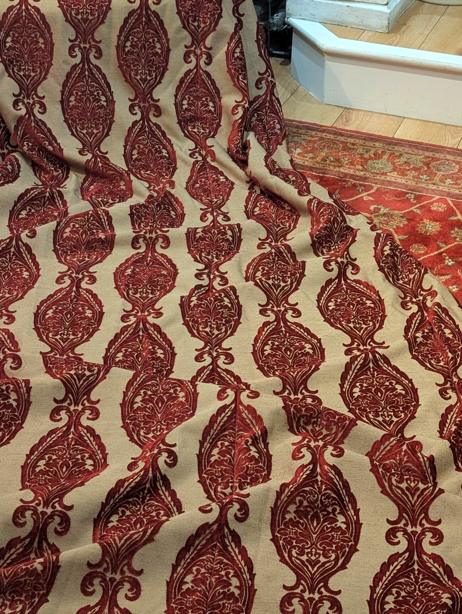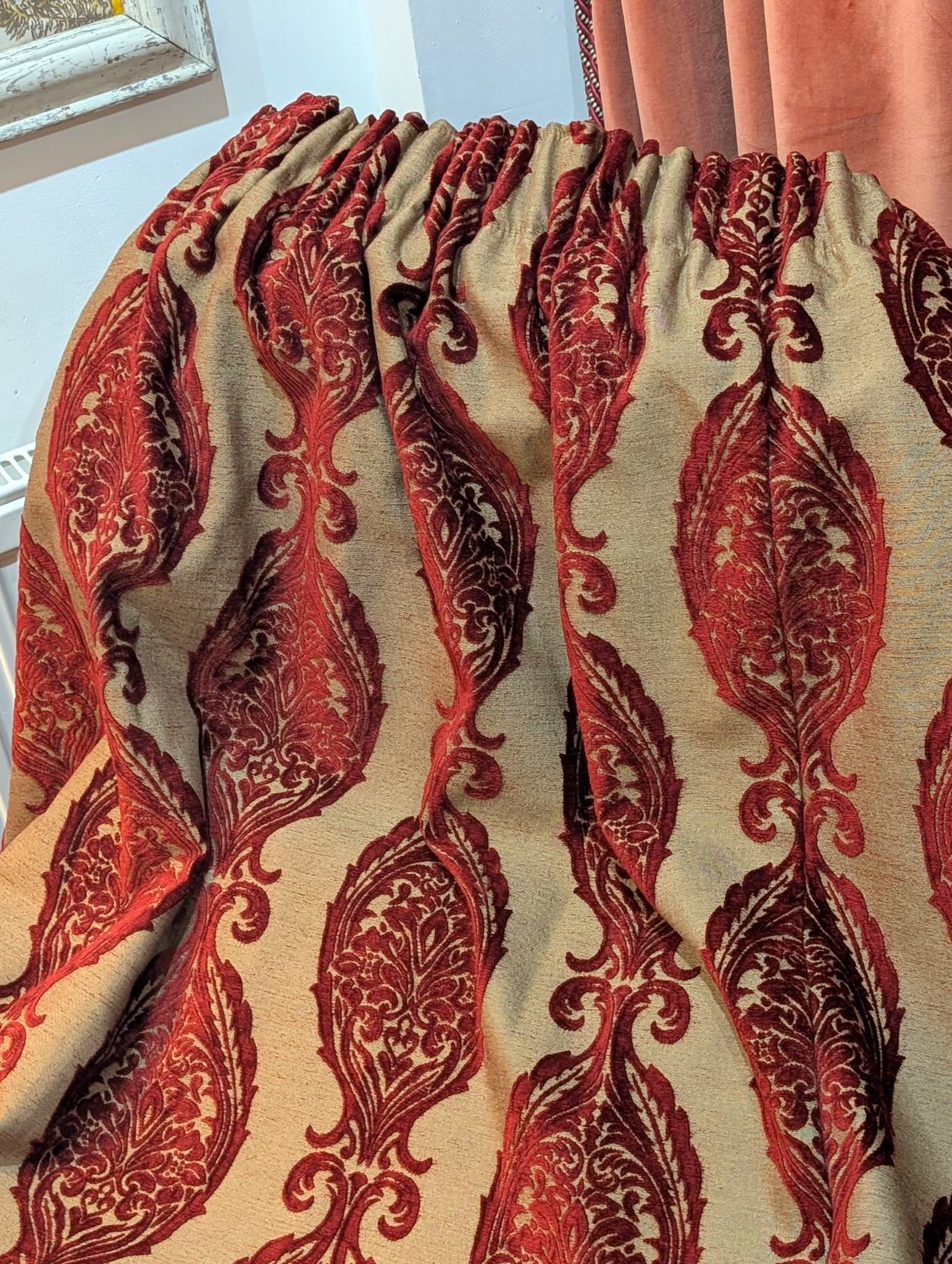 This listing is for up to 3 pairs of amazing very long linen dark red cut damask second-hand curtains. These fabulous curtains come with lining and are in very good and clean condition.
