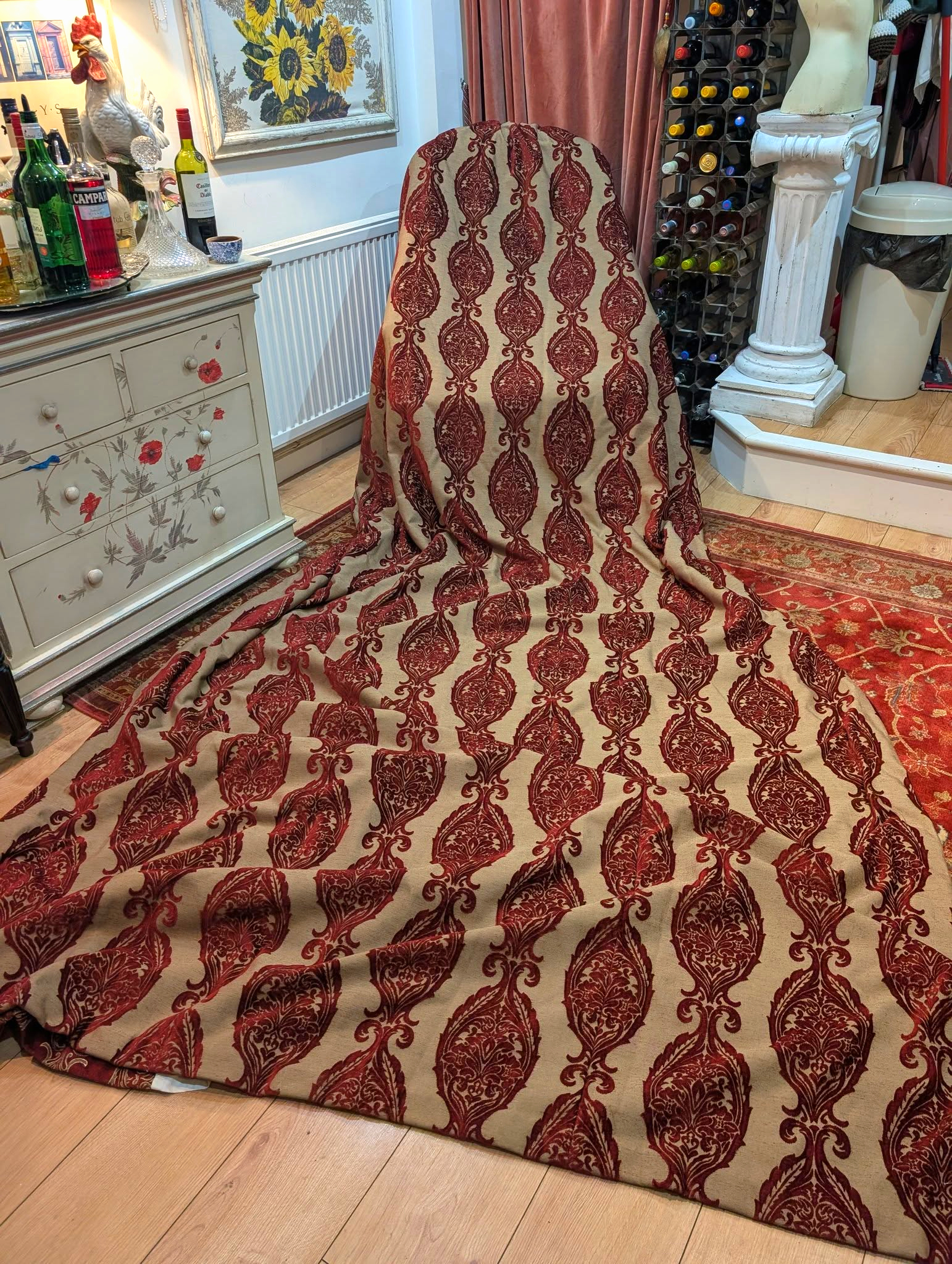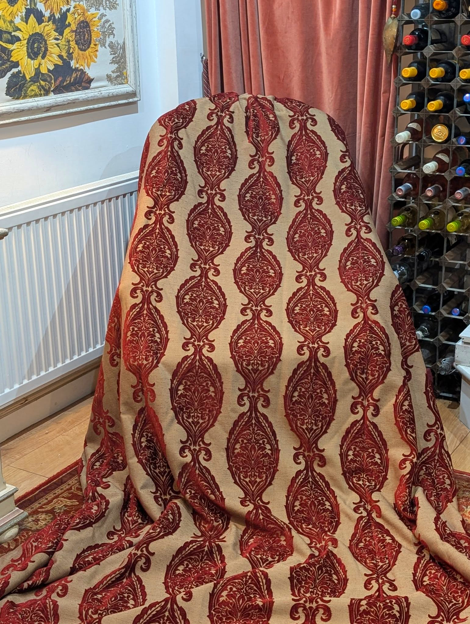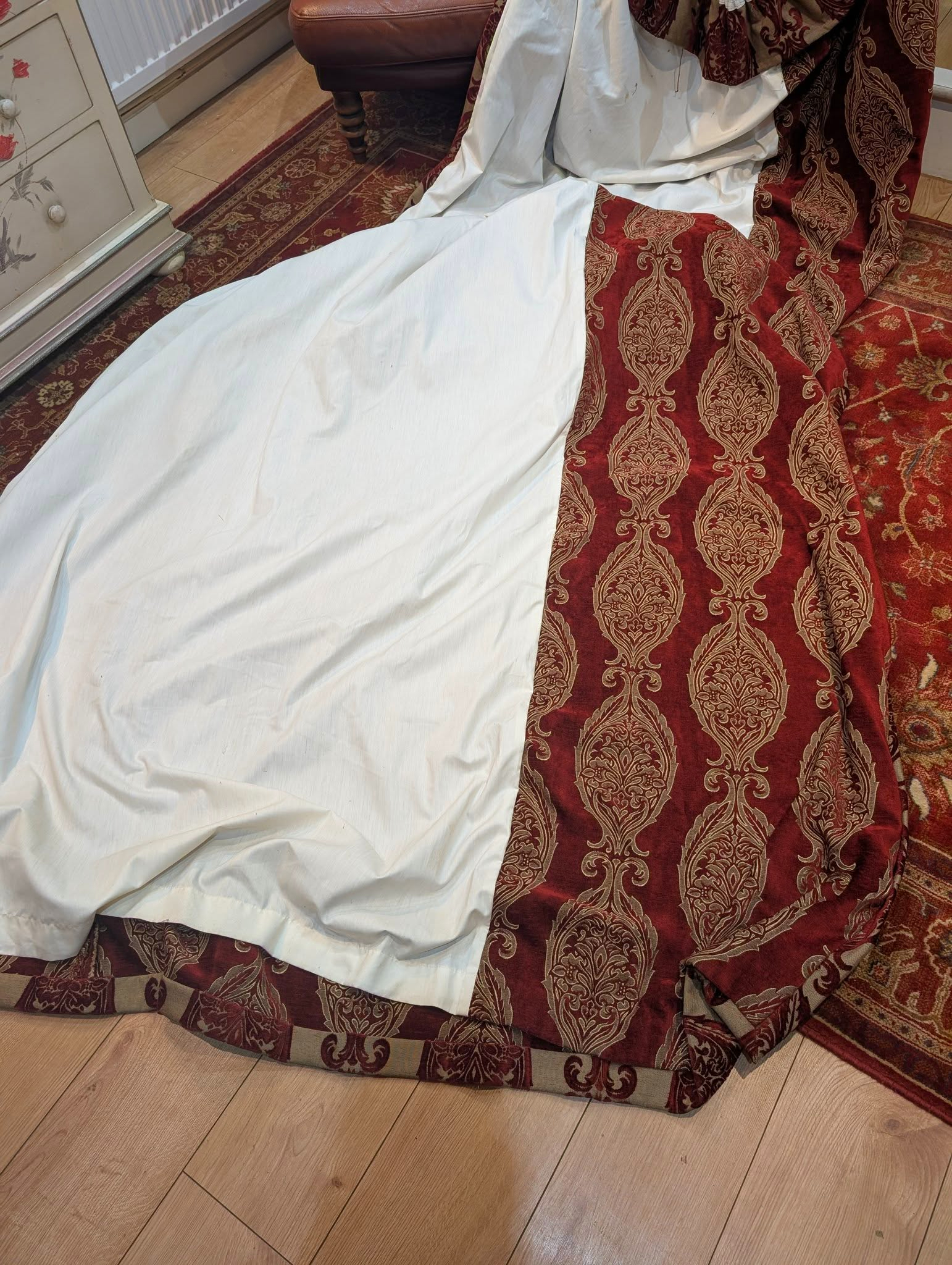 This listing is for up to 3 pairs of amazing very long linen dark red cut damask second-hand curtains. These fabulous curtains come with lining and are in very good and clean condition.